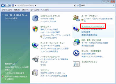 「スタート」-「コントロールパネル」から「デスクトップのカスタマイズ」をクリックする。