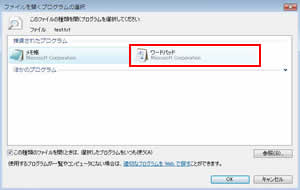 ワードからワードパッドにしてみる。「ほか、のプログラム」をダブルクリックし、リストから「ワードパッド」を選び、「OK」をクリック。