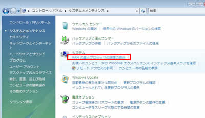 「コントロールパネル」→「システムとメンテナンス」を選択し、「RAMの量とプロセッサ速度の表示」をクリック。