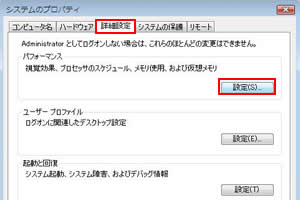 「設定画面」タブの「パフォーマンス」欄にある「設定ボタンをクリック。