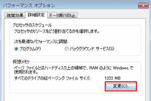 パフォーマンスオプション画面で、「仮想メモリ」の「変更」ボタンをクリック。これで、仮想メモリの設定画面が表示される。