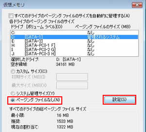 「ページングファイルなし」にチェックを入れたら、「設定」ボタンをクリック。