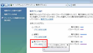 「電源プラン」の「高パフォーマンス」にチェック。続いて、その下にある「プラン設定の変更」をクリック。