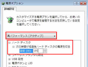 「高パフォーマンス(アクティブ)」であることを確認し、「ハードディスク」の設定時間を変更。ここでは初期設定の20分から、120分に変更。